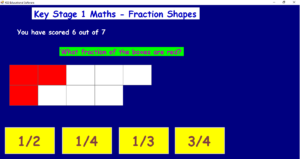 A laser shoots at a line of boxes and turns some of them red. You have work out what fraction of the boxes are red. A score is kept of how well you did.