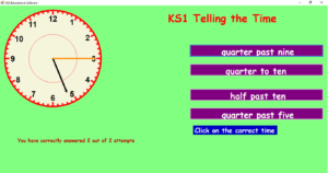 You can choose from 3 levels. Level one is for hours. Level two is for hours and half hours. Level 3 is for hours, half hours, quarter to and quarter past. When you start a time is displayed on the clock and you are given a choice of 4 times to select the one matching the clock. A score is kept of how well you did.
