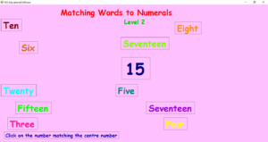 This game has 4 levels and is to help you match words to numbers. A number is displayed in the centre and then 10 numbers appear randomly on the screen. Click on the number that matches the middle one.